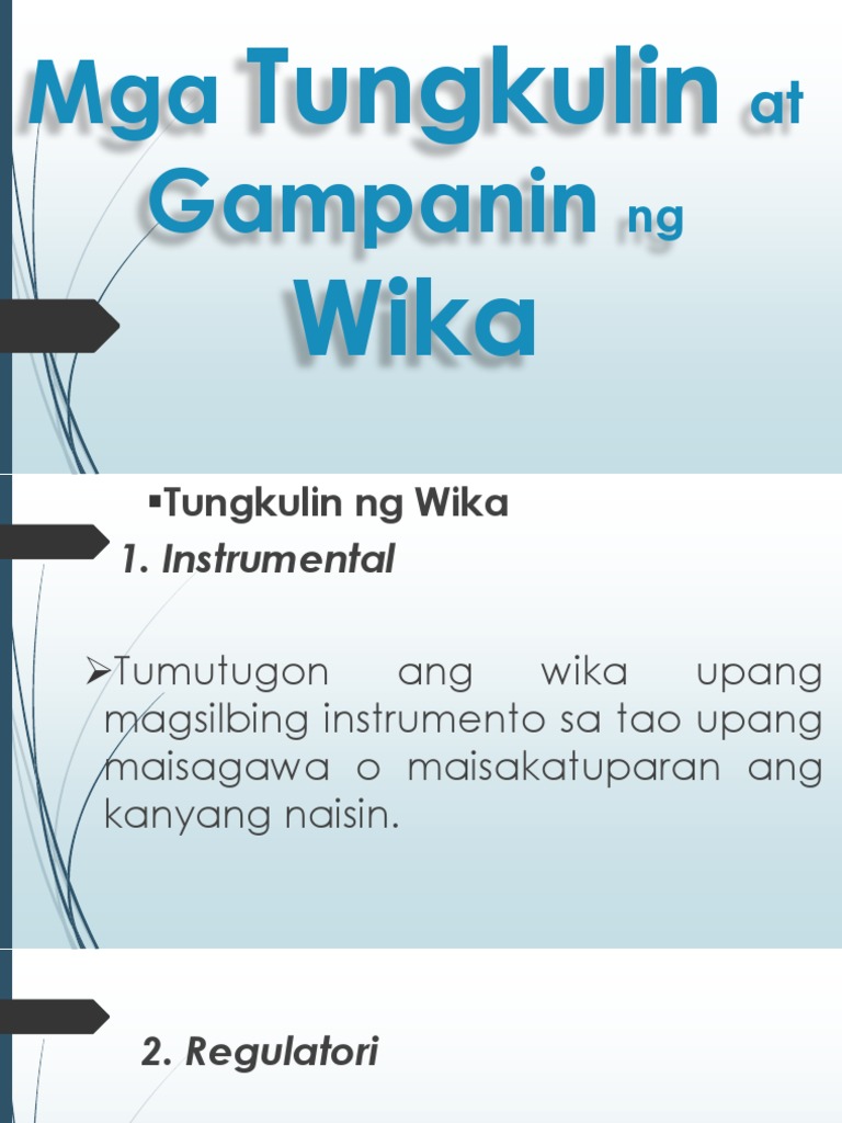 Tungkulin sa paggamit ng wika. Inaabot nito ang isip at damdamin ng mga Pilipino at. Fil11 -mga tungkulin ng wika 1 prev. Buksan mo ang iyong mga mata Tingnan mo ang nangyari sa wika ng bayan wala na.